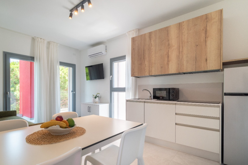 Residencia s výťahom. Každý apartmán má svoje parkovacie miesto. Na streche budovy sú lehátka na opaľovanie.