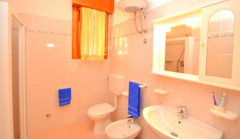 Piesočná s pozvoľným vstupom do vody 600 m od ubytovania, plážový servis v cene alebo psia pláž zadarmo. Pláž je vhodná pre deti, nájdete tu celý rad preliezačiek, hojdačiek, šmýkačiek, trampolínu a iné detské atrakcie.