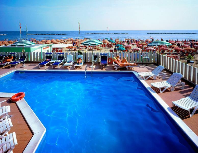 Hotel s bazénom má veľmi výhodnú polohu, pretože sa nachádza priamo pri pláži a pár minút od historického centra Pesaro.