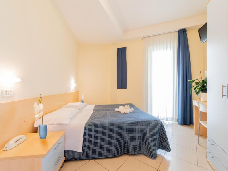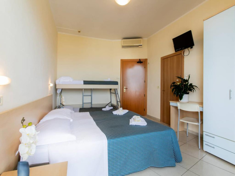 Pre pobrežie Rimini je typická veľmi široká a dlhá pláž so zlatistým jemným pieskom a priľahlou promenádou. Pláž je vhodná pre rodiny s malými deťmi, pretože má pozvoľný vstup do vody. Hotel leží cca 100 m od pláže, plážový servis v cene (slnečník + 2 kresielka / izba). Vodné športy na pláži za poplatok.